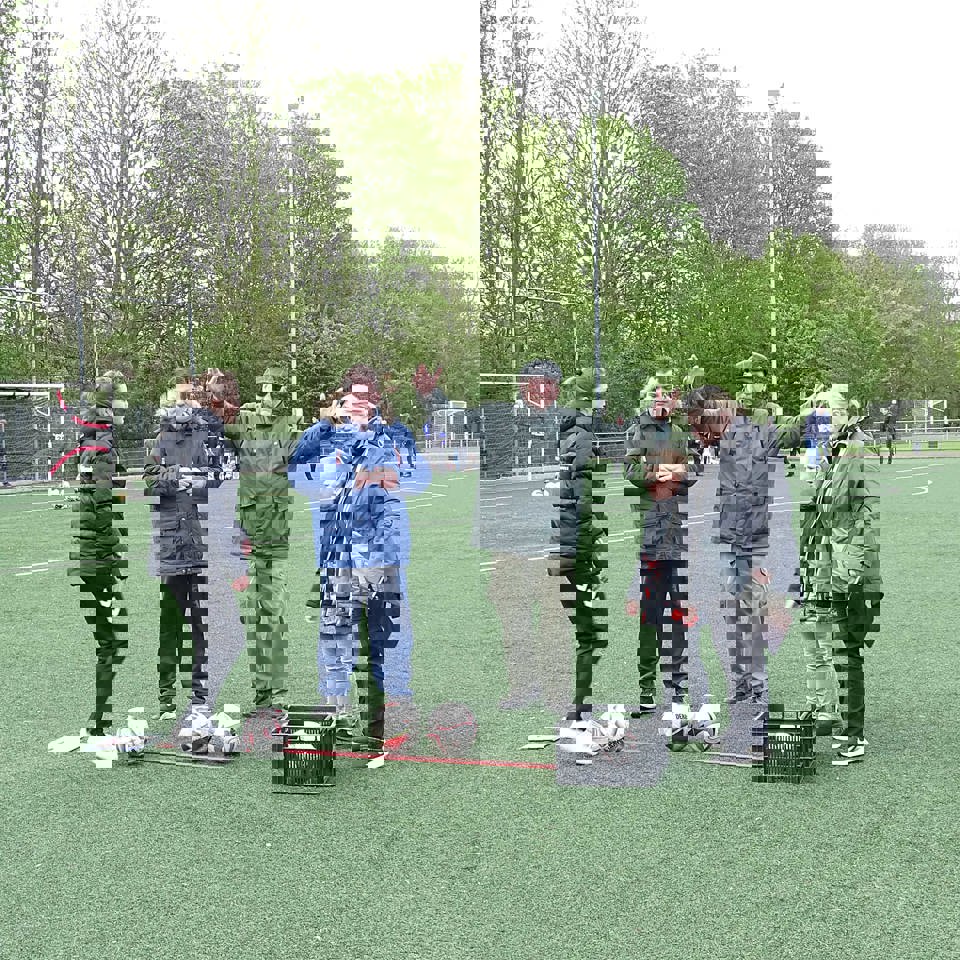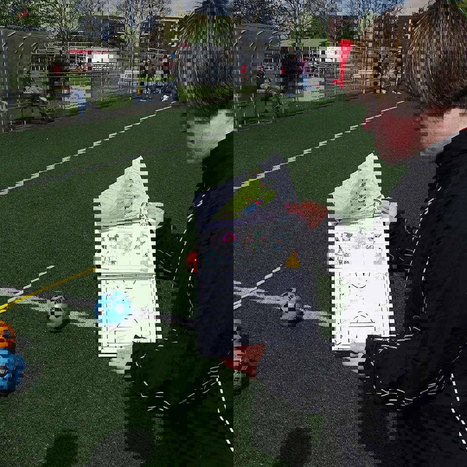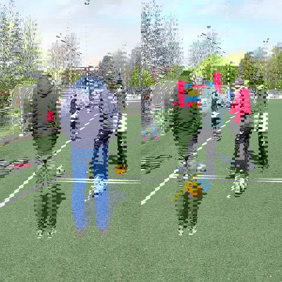 De deelnemers hadden geen last van de wind en gingen enthousiast aan het werk. Op het veld stonden veel opdrachten met verschillende attributen opgesteld. Bij bijna alle opdrachten was een bal nodig. De bal werd gegooid of geschopt. De deelnemers gingen met een spelleider de opdrachten langs en konden punten of een sticker verdienen. De volgorde was niet belangrijk, maar de spelleider keek waar ruimte was. Het was hartstikke gezellig en iedereen genoot met volle teugen.
