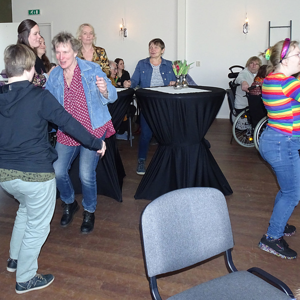 Na de komische act en de toespraakjes ging Rogier de Avonturier aan de slag. Hij vermaakte de aanwezigen met muziek, spelletjes en gekkigheid. Iedereen had het reuze naar de zin. Er werd gedanst, polonaise gelopen en veel gelachen. Tussen alle mensen door deed Clown Toet haar ding. Dat is contact maken met soms zeer gesloten leden. En zij kan dat; ze laat iedereen lachen en zich blij voelen. Heerlijk!