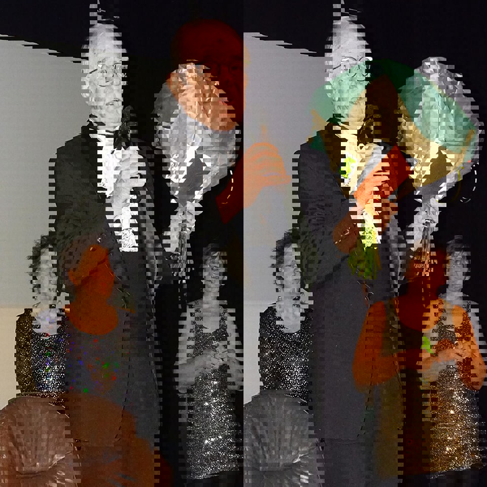 Bloemen en een cadeaubon vanuit het bestuur van de GGK werden door Marijke overhandigd. Daarmee kan Andries met zijn Wil lekker gaan eten.