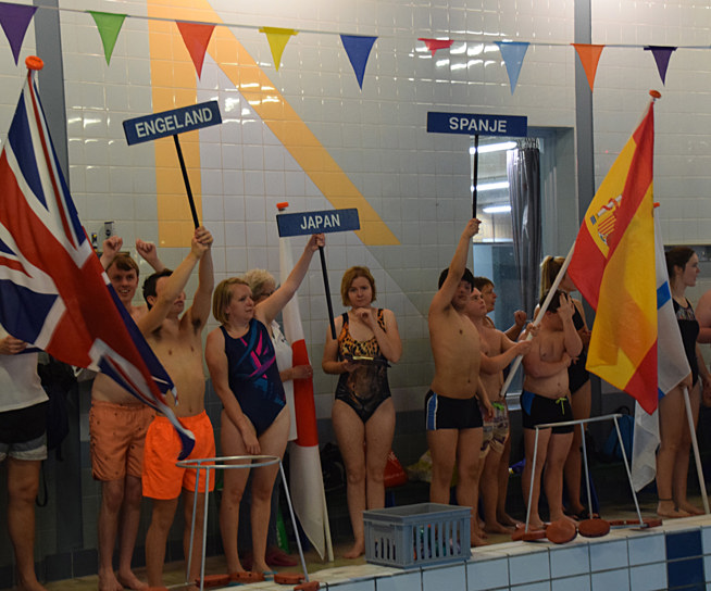 De pupillen kwamen dol-enthousiast in een lange rij binnen en droegen een vlag van het land mee van het land waarvoor zij hun zwemprestaties kwamen leveren. In het zwembad kwam je ogen en oren te kort om de zwemmers te kunnen volgen.