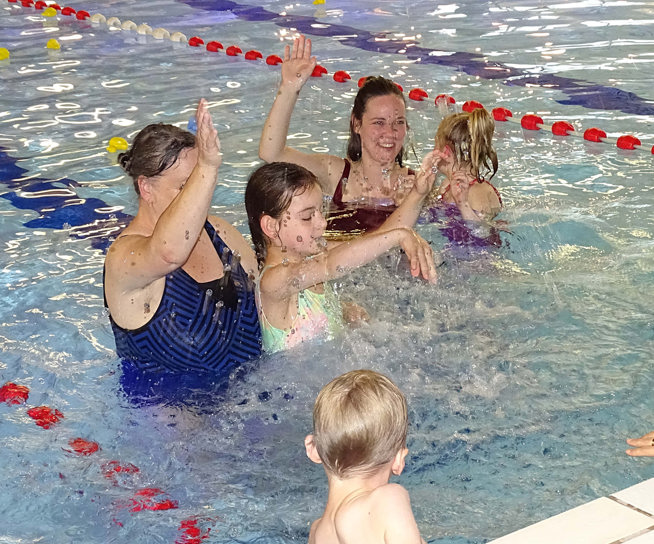 Vlak voor de opening werd moeder-eend te water gelaten met voor iedere pupil een klein eendje voorzien van hun naam. Deze moesten eerst opgezocht worden en daarna werd er gespeeld en ook nog wat gezwommen, waarbij iedere begeleider zijn of haar pupil in de gaten moest houden. Het laatste kwartier ging het wedstrijd-bad nog even open, zodat door iedereen, die wilde of durfde, van de duikplank gebruik kon maken. De vreemdste en wildste capriolen werden door pupillen en vrijwilligers uitgehaald en menigeen liep een rode rug of been op. Sommigen hadden nog een klein zetje nodig (we noemen geen namen) maar uiteindelijk heeft iedereen de sprong gewaagd.