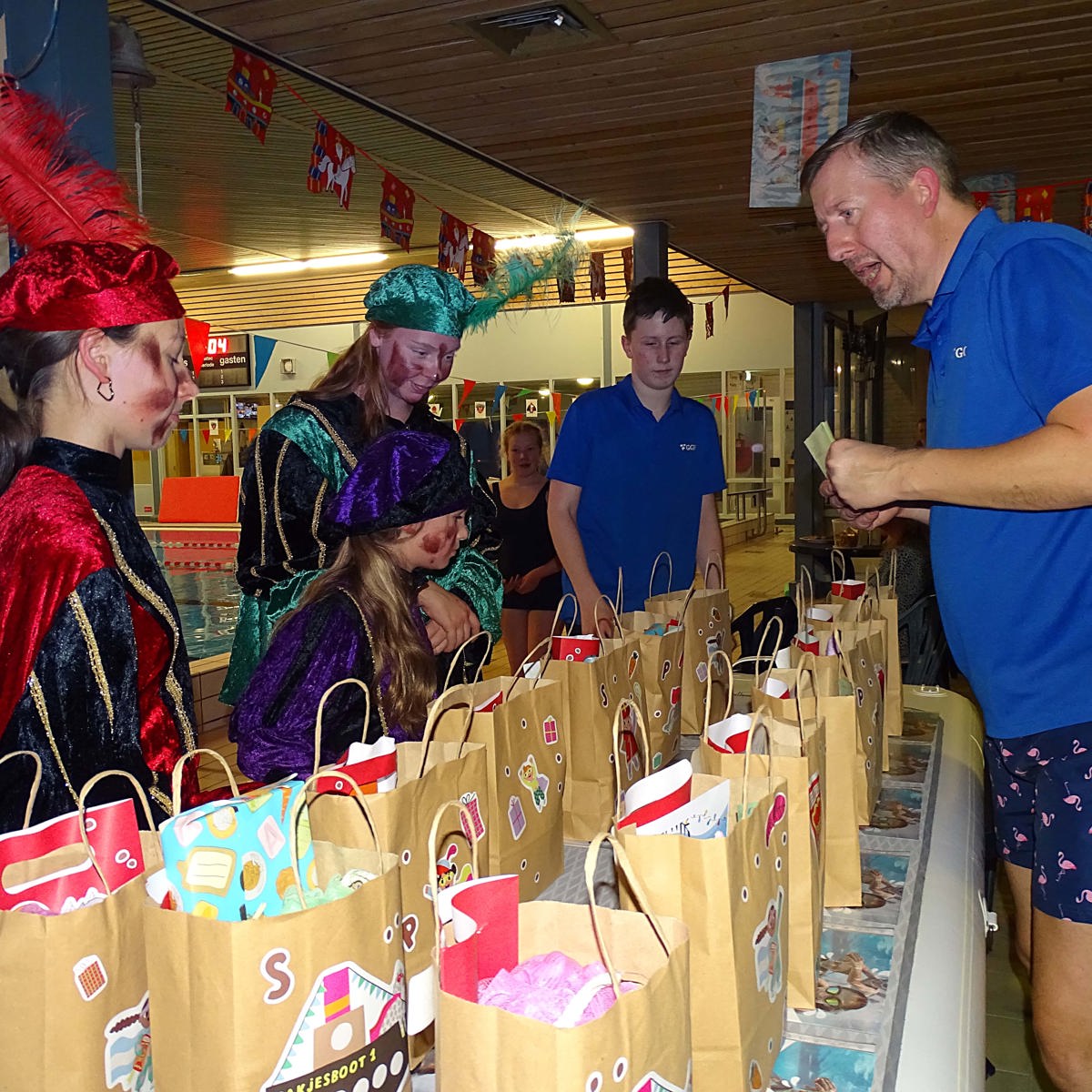 De Pieten die er toevallig toch waren hielpen mee bij het uitreiken van de documenten en de versierselen. Maar ook kregen alle deelnemers en vrijwilligers een zakje met cadeautjes.